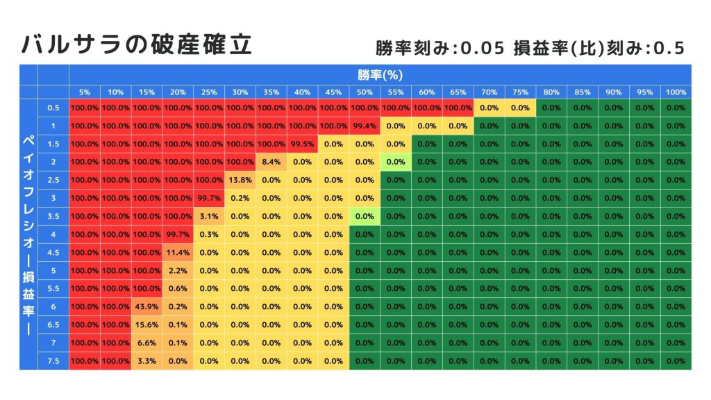 バルサラの破産確率表は、縦軸に勝率、横軸にペイオフレシオを取り、各交点に破産確率が示されています。表は通常、損失許容率ごとに用意されています。