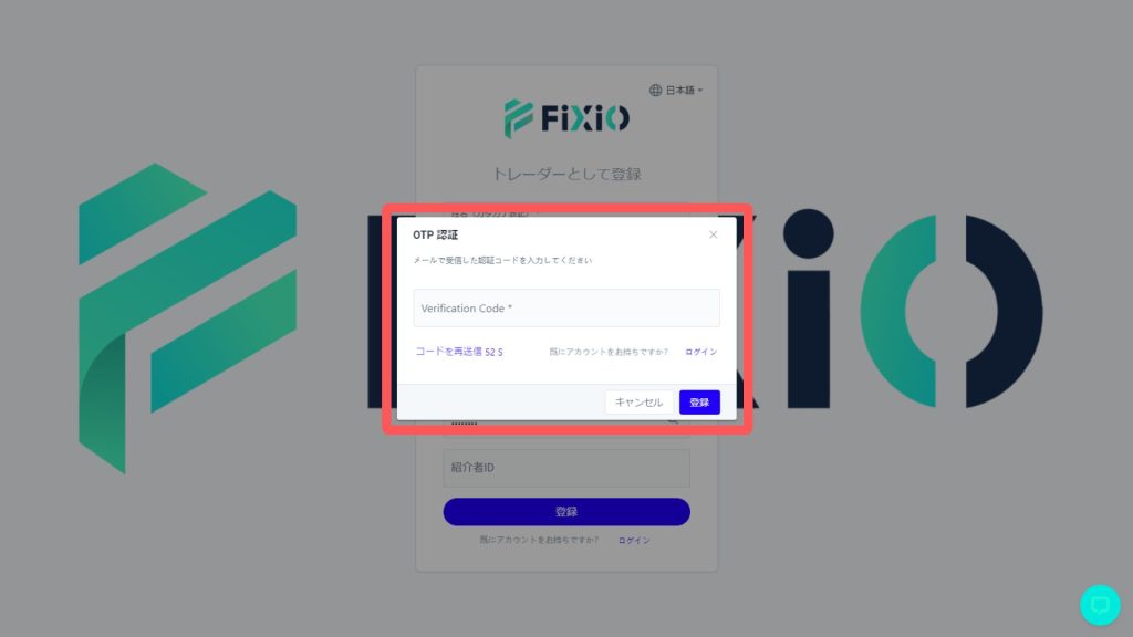 FIXIO公式サイトの登録画面で、6桁の認証コードを入力し登録ボタンを押しましょう。