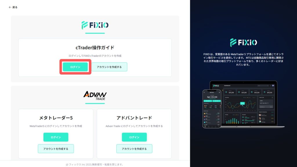 cTrader操作ガイドの「ログイン」ボタンをクリック。