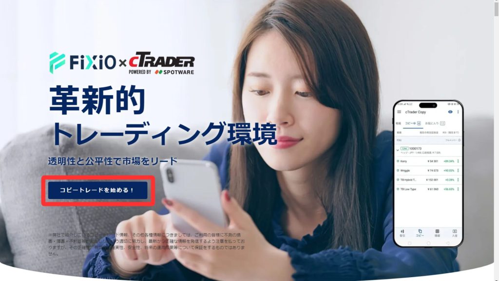 FIXIOのサイトへ行き「コピートレードを始める」をクリック。